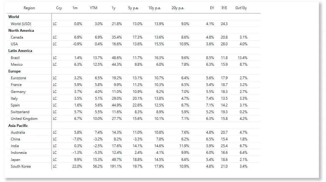 Latin American equities also delivered solid performance. Mexico rose by 6.3%, leading the region, while Brazil gained 1.4% over the month.