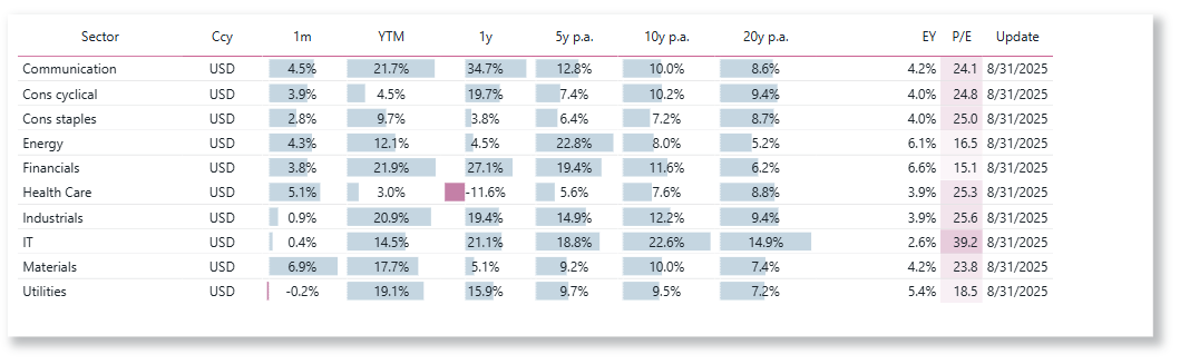Las acciones de la zona euro subieron solo un 0,4 % en agosto, pero el desempeño varió notablemente entre países. Alemania (-1,0 %) se quedó rezagada debido al deterioro de la confianza económica, con datos industriales débiles y un acuerdo comercial con EE. UU. que afectó a sectores clave como automóviles y químicos. Francia (-0,8 %) también tuvo dificultades, ya que la agitación política y el riesgo de colapso gubernamental minaron la confianza y ampliaron los diferenciales de bonos. En contraste, Italia (+3,1 %) y España (+4,4 %) lograron fuertes avances, apoyados por una estabilidad política relativa y una mejora del sentimiento interno que atrajo a los inversores hacia los mercados del sur de Europa. Suiza (+2,8 %) también avanzó, beneficiándose de su posición defensiva y de la fortaleza del franco suizo. La divergencia pone de relieve cómo las dinámicas políticas y económicas locales generaron una importante dispersión en el mercado de renta variable de la zona euro en agosto.