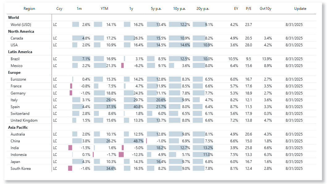 Las acciones asiáticas tuvieron resultados mixtos en agosto. Japón (+4,3 %) y China (+3,8 %) lideraron las ganancias, apoyados por señales económicas más favorables y medidas de apoyo político, mientras que Australia (+2,0 %) también avanzó gracias a la fortaleza de los recursos. En contraste, India (-1,5 %) y Corea del Sur (-1,6 %) retrocedieron en medio de recogida de beneficios y preocupaciones sobre el crecimiento, y Indonesia terminó el mes prácticamente sin cambios. La dispersión puso de manifiesto la divergencia de factores domésticos en la región.