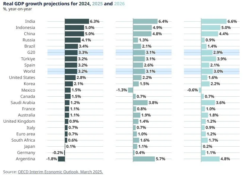 Global GDP growth is expected to moderate from 3.2% in 2024 to 3.1% in 2025 and 3.0% in 2026, with higher trade barriers in several G20 economies and increased policy uncertainty weighing on investment and household spending. Annual real GDP growth in the United States is projected to slow from its very strong recent pace, to 2.2% in 2025 and 1.6% in 2026. Euro area real GDP growth is projected to be 1.0% in 2025 and 1.2% in 2026, as heightened uncertainty keeps growth subdued. Growth in China is projected to slow from 4.8% this year to 4.4% in 2026.